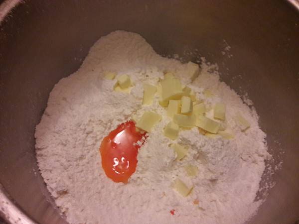 過篩麵粉,加入切成小塊的奶油蛋黃