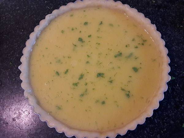 倒入塔皮中,左右搖勻至平整,撒上檸檬皮屑裝飾