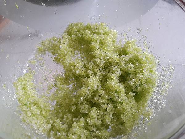 將檸檬皮屑搓下,記住不要搓到白色的皮,會苦