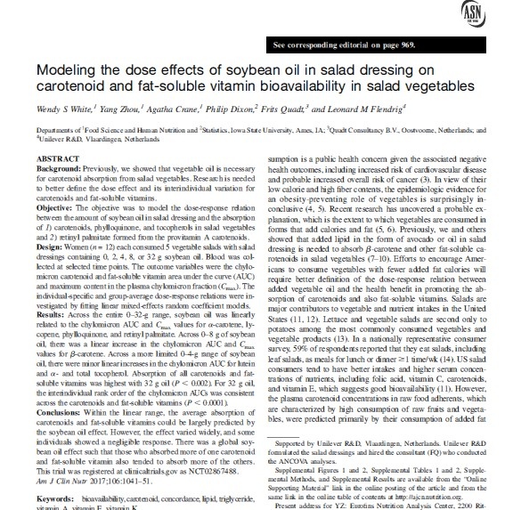 引述2017年的「Modeling the dose effects of soybean oil in salad dressing on carotenoid and fat-soluble vitamin bioavailability in salad vegetables」實驗論文