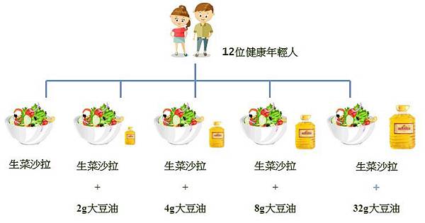 將12位健康的年輕人隨機並分次完成五種生菜沙拉與大豆油的配方飲食