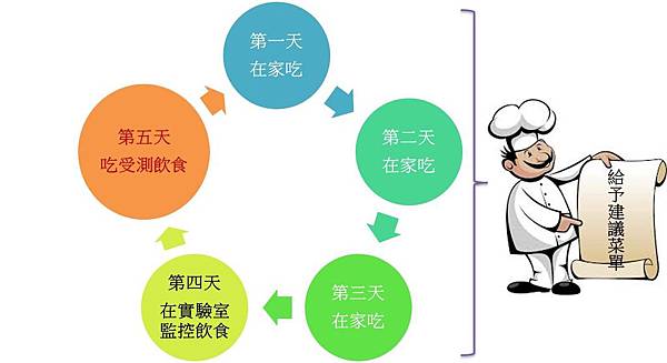 (註:第一天到第三天:給予無上述營養素的建議菜單;第四天:受試者在實驗室吃提供的飲食;第五天第一餐吃下受測的生菜沙拉)