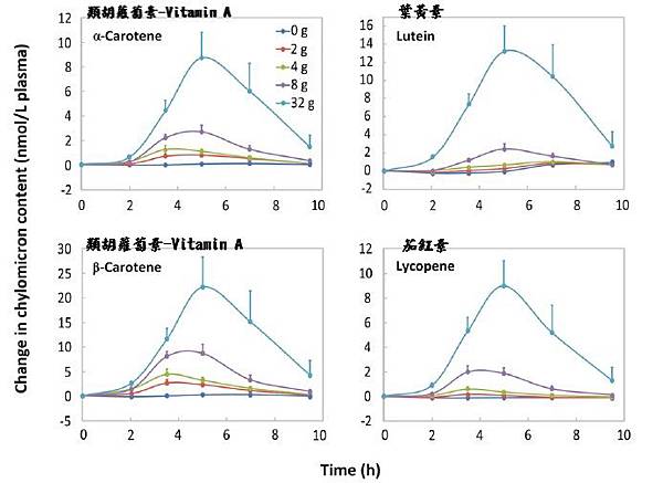 β-胡蘿蔔素(右下角的圖):當油脂量達8公克以上,營養攝取的效率便大打折扣