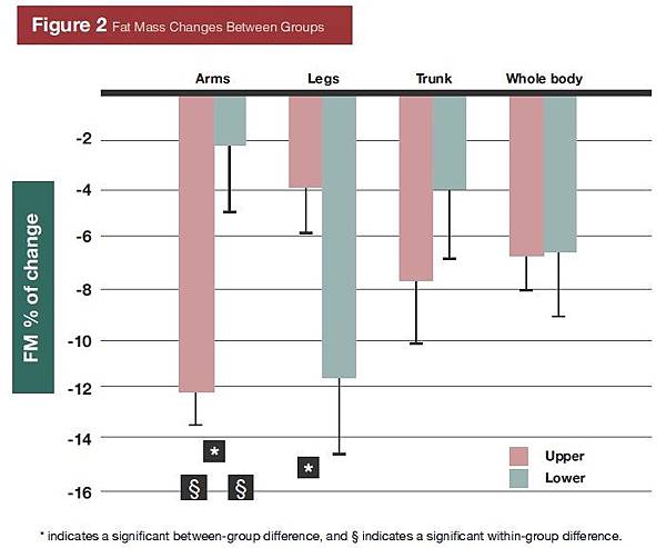明顯地,上肢組在上半身肥肉減少量贏過下半身肥肉減少量