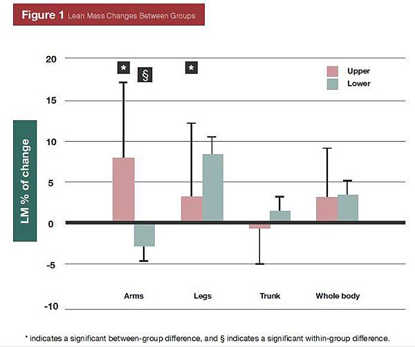 明顯地,上肢組在上半身增肌贏過下肢組;下肢組在下半身增肌贏過上肢組